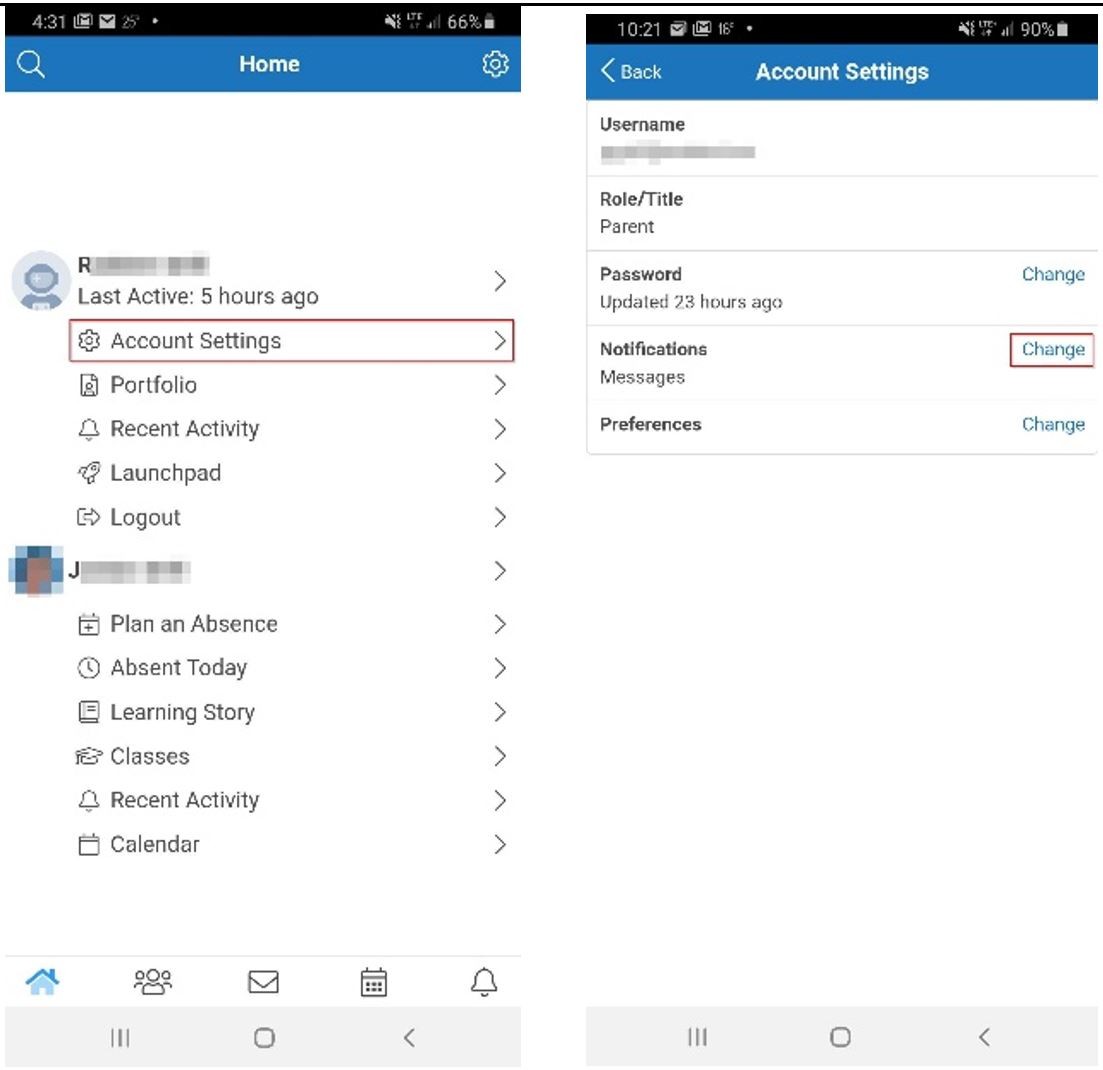 | Open the Edsby App (this document assumes you have accepted the invite and you are logged in to the app. If you didn’t receive an invite, contact your child’s school. For help logging in, please visit (https://edsby.lskysd.ca/parents.html) 1. Ensure that you are on the ‘Home’ screen (as shown in first image) 2. Under the Parent’s name – tap ‘Account Settings’ 3. Beside ‘Notifications’- tap ‘Change’ | ![]() |