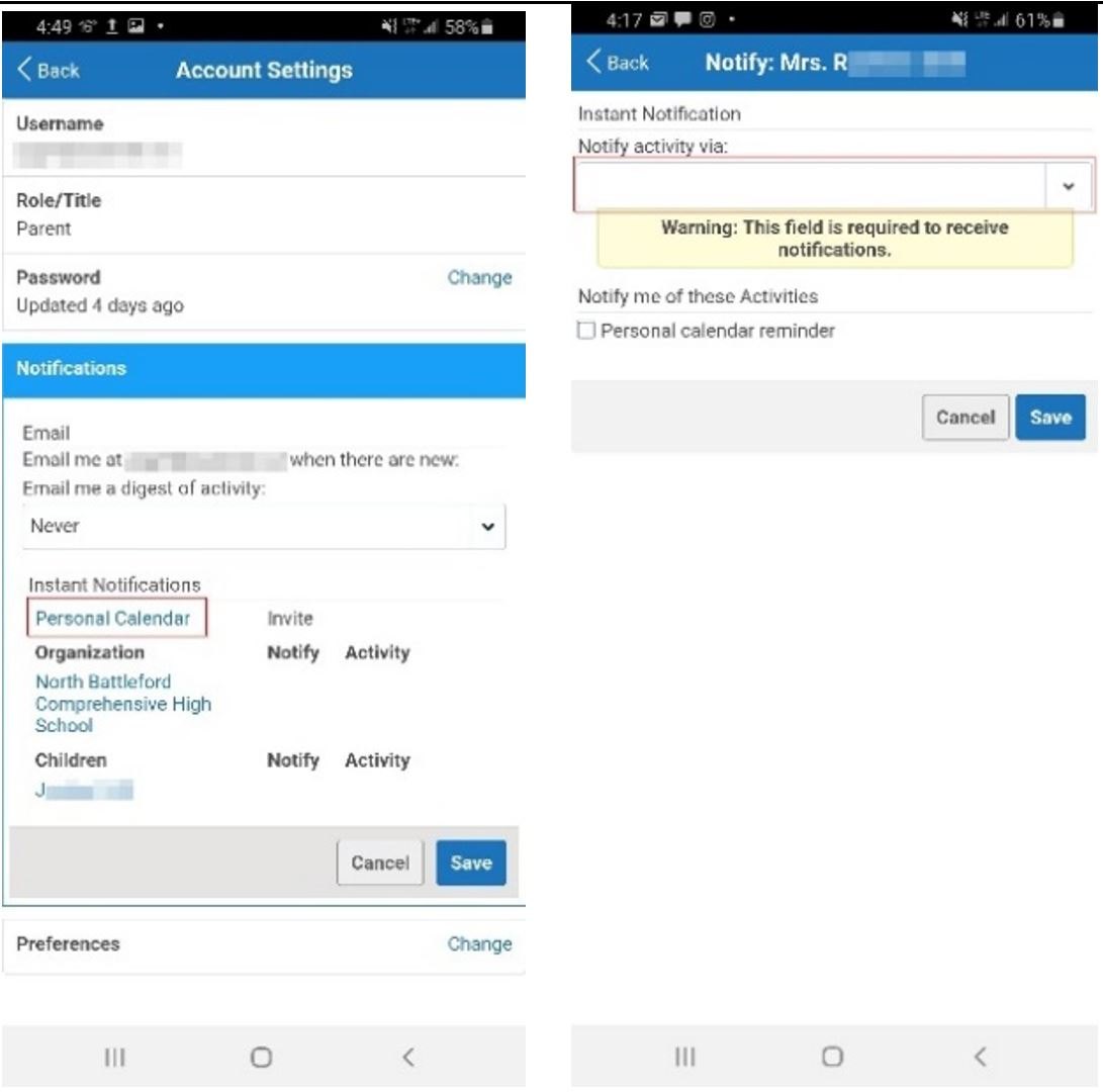 4. Choose the desired method(s) of notification (one at a time) 5. Under ‘Notify me of these Activities’ - tap the box beside ‘Personal calendar reminder’ 6. Tap Save | ![]() |