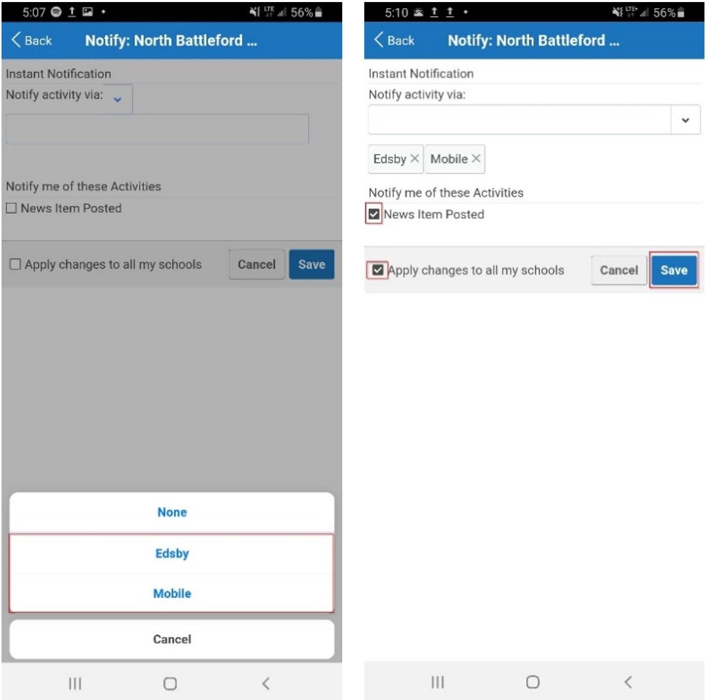 3. Choose the desired method(s) of notification (one at a time) 4. Under ‘Notify me of these Activities’ - tap the box beside ‘News Item Posted’ 5. Tap the box beside ‘Apply changes to all my schools’ 6. Tap Save | ![]() |